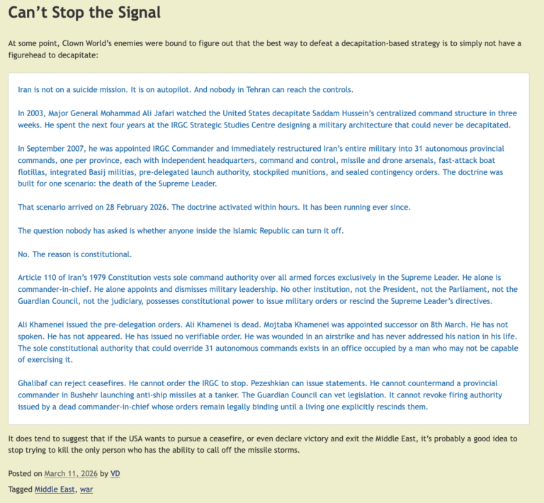 Posted by Guessedworker on Sun, 08 Mar 2026 22:58 | # Manc, for the most part I don’t think Morgoth is too wayward with his Retard article, given that he hasn’t thought about China and energy and so goes for Israel. My own posting on Iran has been rather less sensationally couched but arrives at the same conclusion that the British government must not get sucked in: